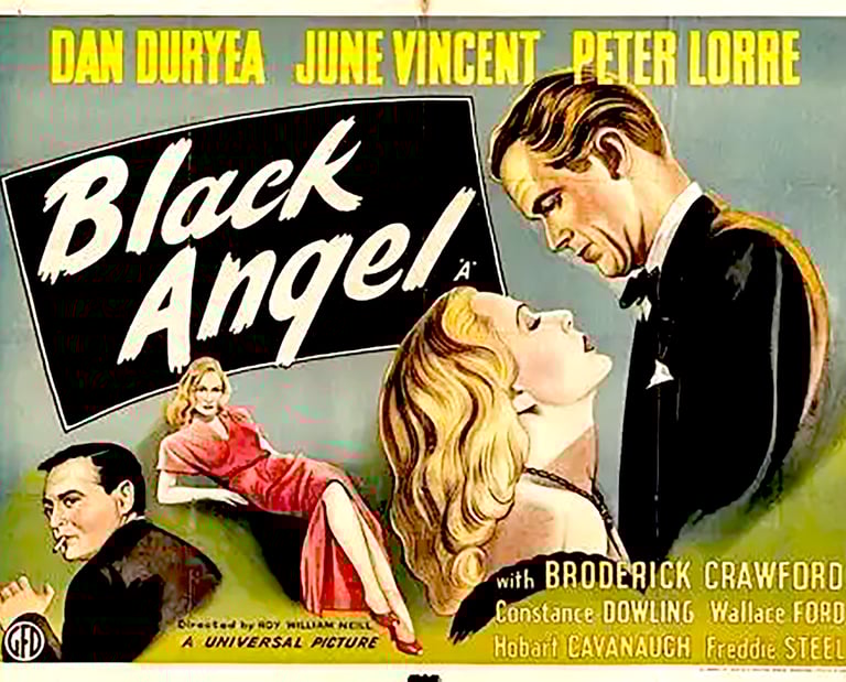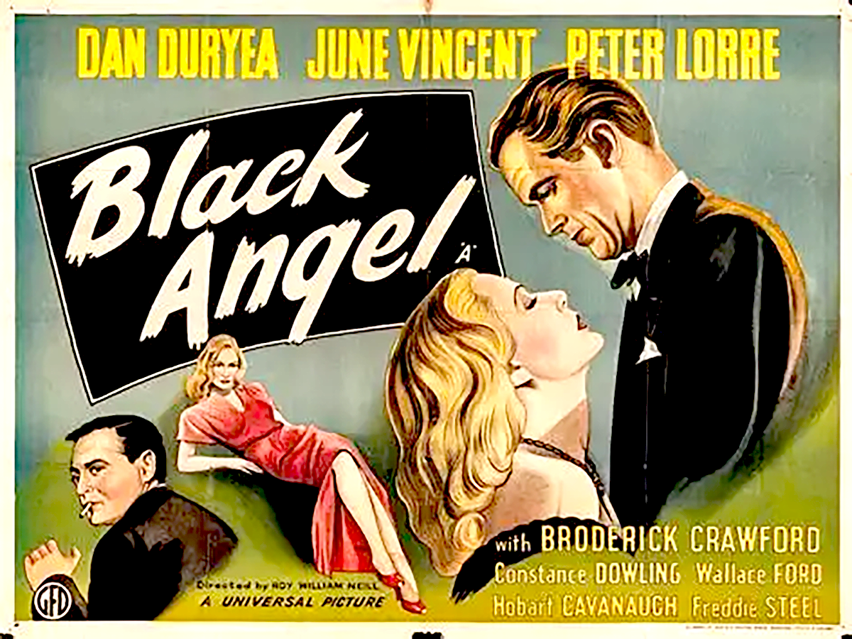 Just as the opening credits are presented in Lured, here the opening credits are also gimmicky, focusing on the cover of the Black Angel novel and opening it to reveal photos of stars Dan Duryea, June Vincent, and Peter Lorre, as well as the supporting cast, along with credits. This would be director Roy William Neill’s final directing and co-producing duty, having directed the Universal Sherlock Holmes series with Basil Rathbone and Frankenstein Meets the Wolf Man. He would die shortly after directing this movie from a heart attack. And another reason the novel was stressed is the fact that it was written by Cornell Woolrich, perhaps one of the finest noir/mystery writers (some of his work includes Rear Window, The Phantom Lady, and Val Lewton’s The Leopard Man).