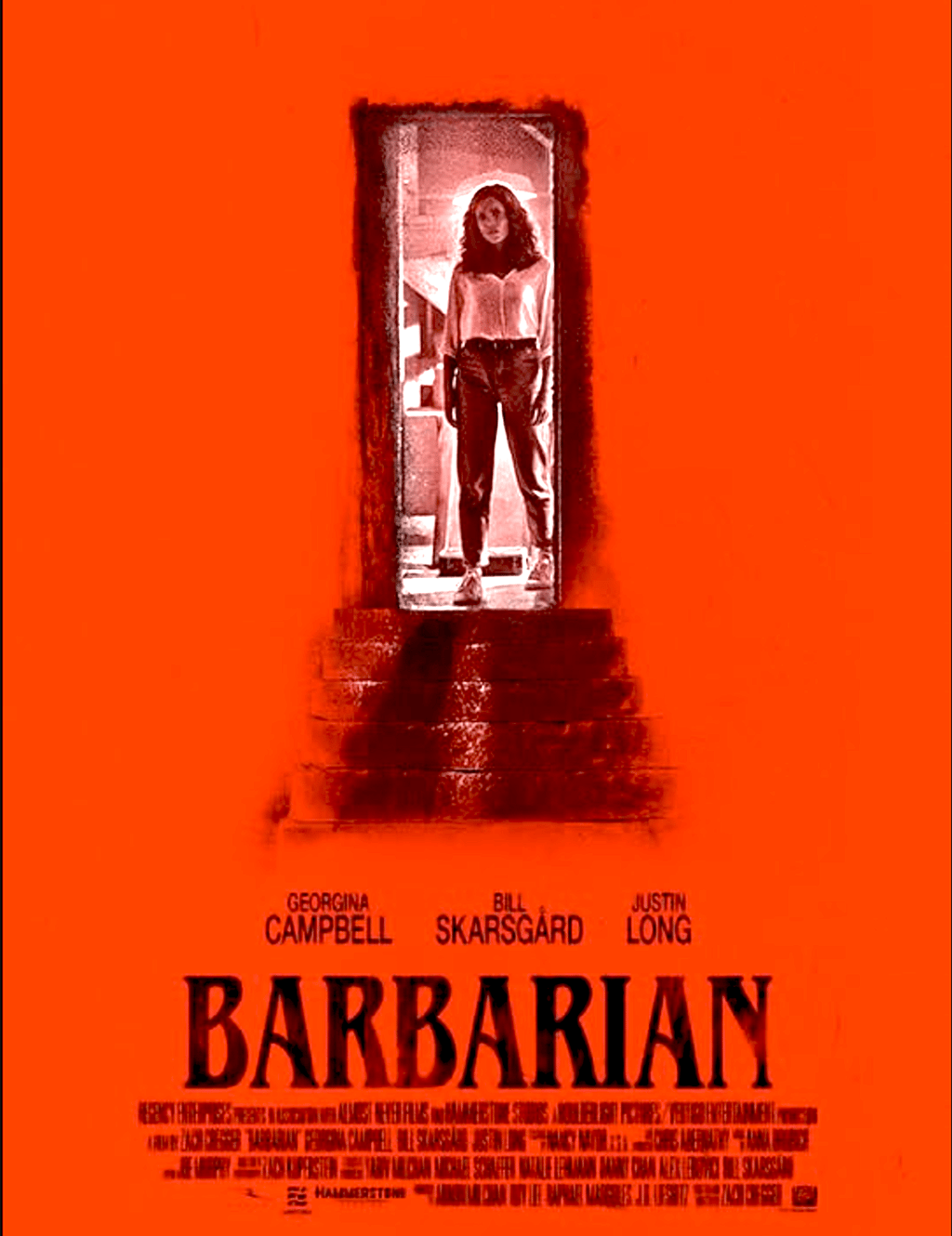 Tess (Georgina Campbell) has rented an out-of-town Airbnb near a business meeting she must attend. On a rainy night, with cackling, anguished voices in the soundtrack, she drives to her rental cottage. She can’t unlock the front door. She surveys the surrounding neighborhood, but it’s too dark to see. Noticing a light inside, she rings the doorbell, and … Keith (Bill Skarsgard), a total stranger, answers. He says he has also rented the place, and on the porch, the two discuss a solution as the title, Barbarian, appears in bold pink letters crawling with insects. Is this a red flag? Can Keith be trusted? Should Tess agree to go inside to discuss the matter?
