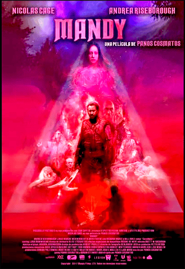 The kidnapping plan is enacted. The enigmatic movements of supporting characters and trancelike music create an almost Lynchian mood, but describing the lights, colors, and oddities doesn’t do justice. There are scenes of hallucinogenic drug-induced indoctrination of Mandy into the cult. I’m just going to say the attempts don’t go well.