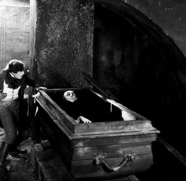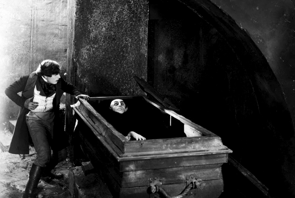 Hutter awakens the next morning, terrified and clutching his throat. He runs from the castle and opens a wooden door leading to a crypt shrouded in shadows, with a single coffin inside. Looking at the top of the broken coffin, he sees Nosferatu’s face and a hand. With strong effort, Hutter quickly opens the coffin lid and finds the black-cloaked vampire lying still, with his large hands crossed. Hutter steps back fearfully. Returning to his room, Hutter sits on the floor, trembling. He then watches as Nosferatu, with great strength, loads about five earth-filled boxes onto a horse-drawn carriage and rides away. Hutter creates a rope ladder from sheets to escape his room. Once out, he falls asleep outside from complete exhaustion.