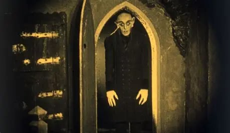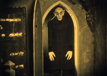 As his driver approaches the Carpathian Mountains, he refuses to go any farther. Hutter continues traveling on foot. After crossing a bridge, the eerie atmosphere becomes more tense. A carriage approaches and stops, clearly ridden by a cloaked Count Orlok. Hutter hesitantly gets into the coach, and they keep driving. The driver halts the coach, indicates the way, and Hutter walks the rest of the way. After a short walk, Hutter enters the castle and is greeted by the slender, rat-like Orlok (Max Schreck). The vampire, towering over Hutter, says he has waited too long. It is almost midnight, and the servants are asleep.