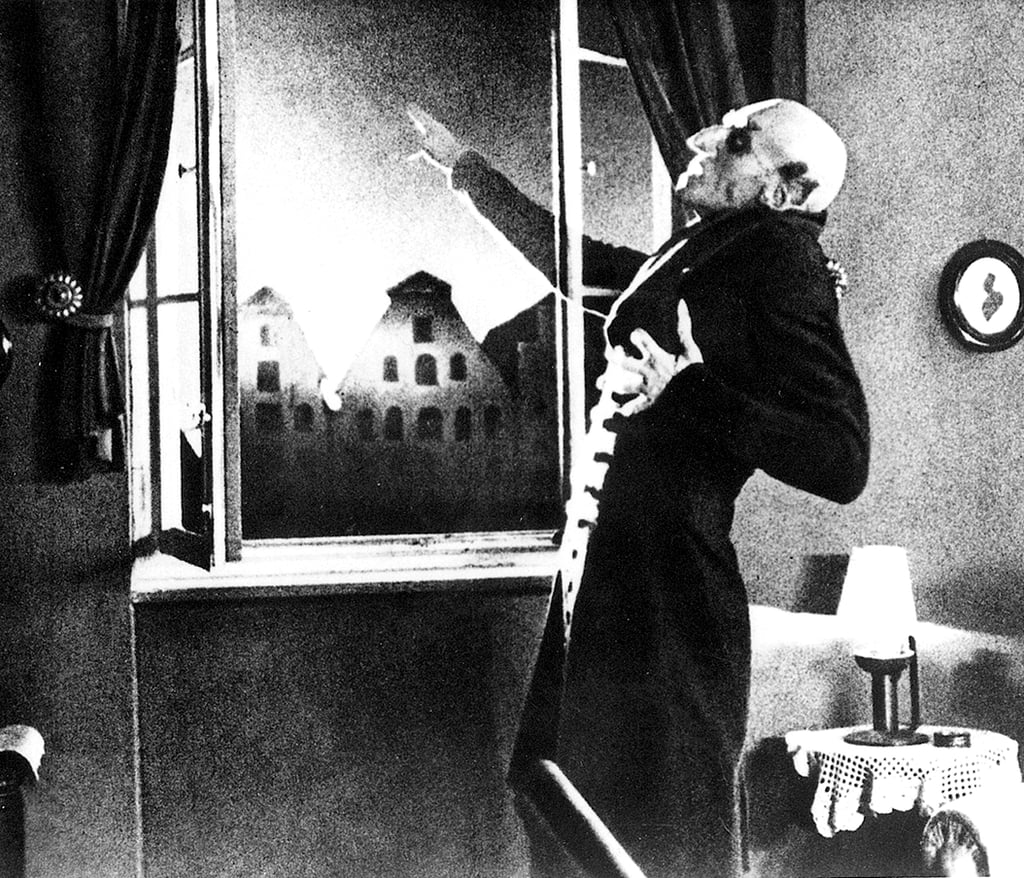 To further demonstrate what I mean, take the ending of Nosferatu, where the elongated shadow of Orlok creeps through Ellen’s house, finally materializing at her bedside, bending over to drink her blood. When the rooster crows, the vampire is disturbed, knowing daylight approaches. Orlok approaches the bedroom window, sees the sunrise, and becomes transparent, dying.