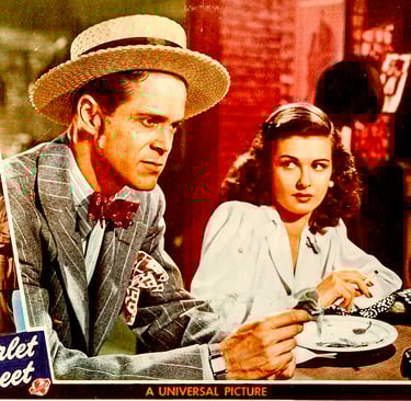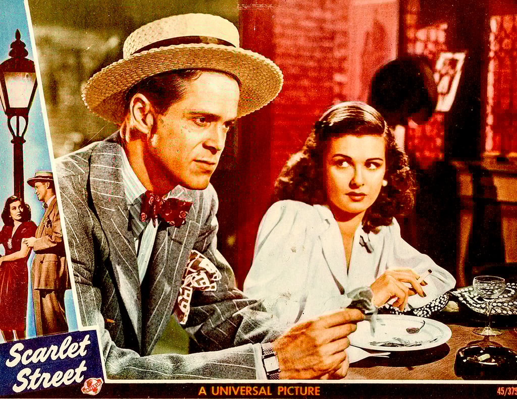 As Hans Salter’s music swells, we see a drawing of a lamppost lowering to reveal a street sign, Scarlet Street, as the opening credits roll. The scene begins with a shot of a busy cityscape. Inside one of the buildings, a lively group of ten people sings “Happy Birthday” to Chris Cross (Edward G. Robinson). One party-goer, the boss J.J., has to leave, but first presents a 14-carat, 17-jewel pocket watch engraved with “25 years of faithful service” to Chris. The group then sings “For he’s a jolly good fellow” after Chris gives a heartfelt speech. Another man departs with the crowd, but first hands Chris a cigar. As J.J. Hogarth (Russell Hicks) leaves, he says the party’s on him and encourages everyone to stay and enjoy themselves. The employees notice that the boss gets into a car with a young blonde, old enough to be his granddaughter. “The boss is stepping out!” one coworker remarks.