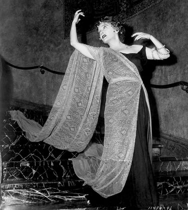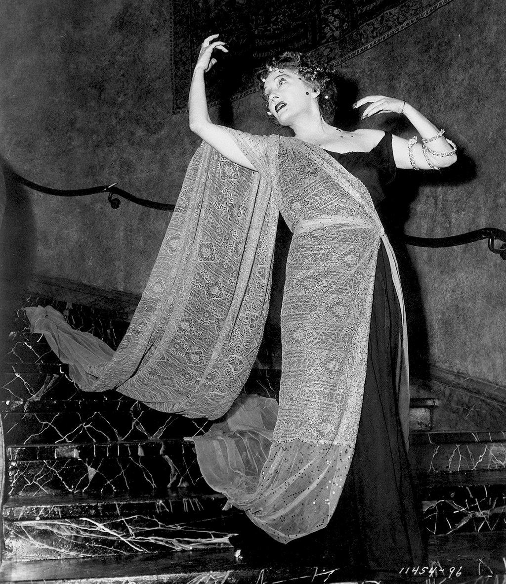 NORMA DESMOND DESCENDING THE STAIRCASE, STRIKING A POSE AT EVERY STEP.