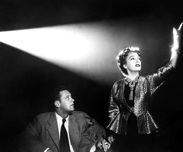 WHILE WATCHING A MOVIE, NORMA DESMOND STEPS INTO THE SPOTLIGHT, WHILE JOE GILLIS (WILLIAM HOLDEN) LOOKS ON.