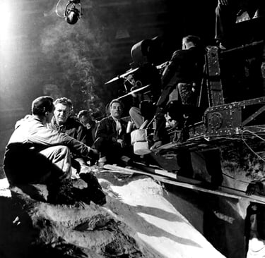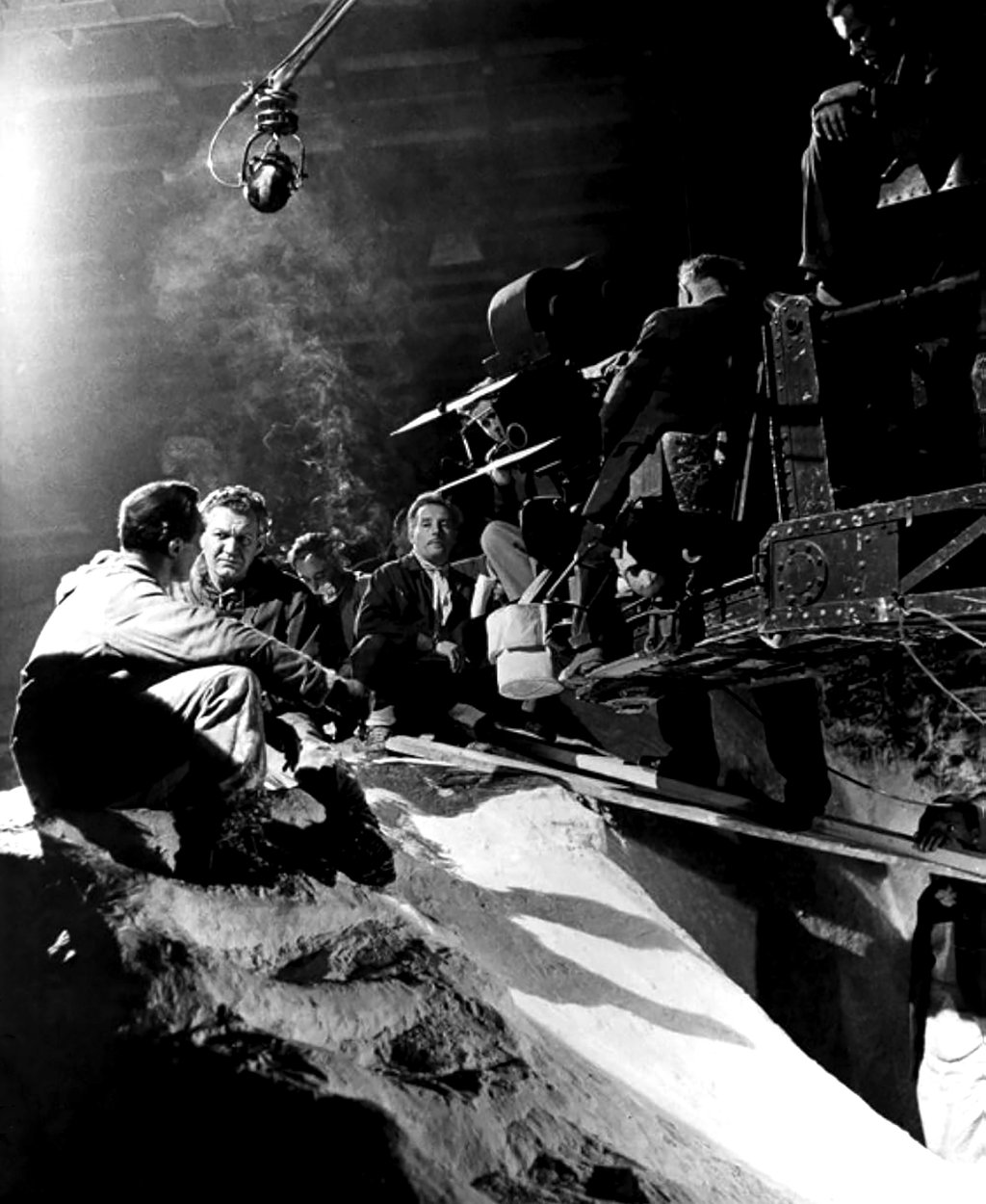 PETER CUSHING AND FORREST TUCKER WITH THE PRODUCTION CREW ON THE SET.
