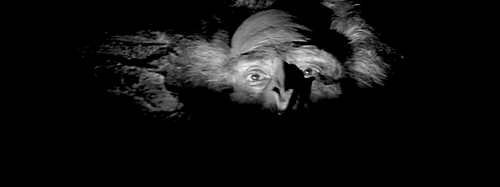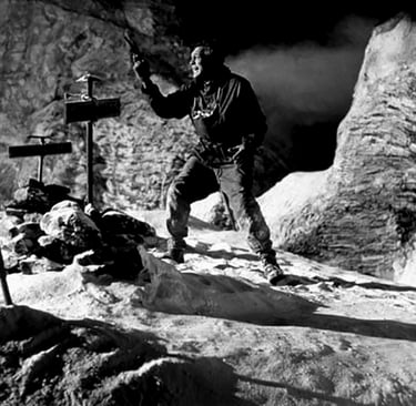 Hammer was known for generating suspense, as shown by the creatures' guttural howls, their silhouettes, a furry claw reaching under the tent, gunshots, and giant footprints in the snow. When the Yetis are clearly shown in a climactic sequence, the standout shot captures the Yeti’s face and eyes. Even the man whose eyes were shown in this scene was not given screen credit, but is known to be John Rae.