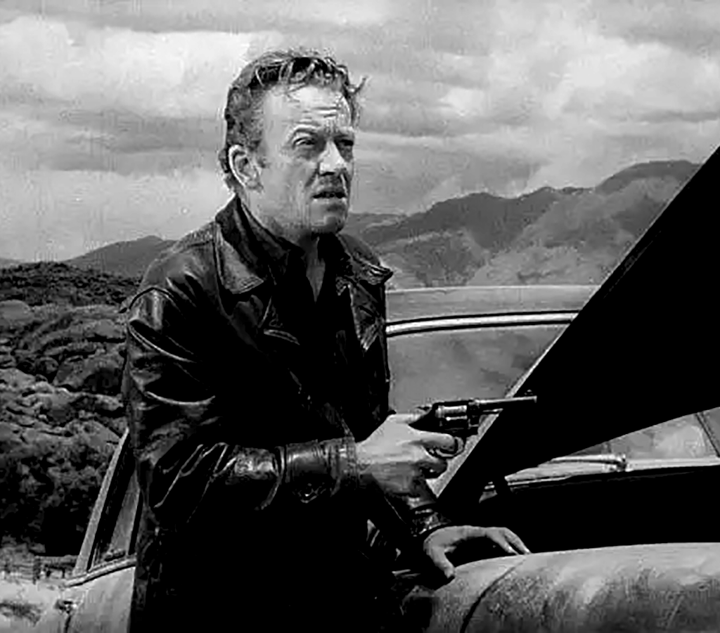Then, while driving down a dusty highway, they come across a hitchhiker thumb in hand next to a broken-down car. The hitchhiker, sitting among the shadows in the back seat, doesn’t speak. When Gilbert turns around to offer him a cigarette, he sees the man has a gun pointed at him. The man, Emmett Myers (William Talman, soon to be famous as Hamilton Berger on Perry Mason), tells the men not to turn around and keep driving, warning them not to make any quick moves because there are a lot of false heroes back there. Emmett then tells the two to turn onto the next road, stop, and open the glove compartment. Inside, they find junk, including gun cartridges. Emmett orders them to always exit the car in the same way. Once outside, Emmett frisks the men and watches as they open the trunk. Inside, they find blankets and a rifle. Emmett takes the rifle.The car is now speeding down the highway, Emmett sitting in the backseat with a pistol. Playing around with his gun, Emmett panics when Roy hits a bump in the road, which he refers to as making a fast move. The car drives on. Emmett asks the men about their private lives and when they are expected home. Then a highway checkpoint appears with a policeman with a rifle. They drive directly past without incident. Emmett comments on how well their car rides: “Pretty good!” He plans to sell the vehicle when they arrive at their destination. But for now, he orders the men to fill up with gas and get a map.