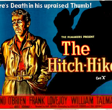 Ida Lupino made a superior film noir with The Hitch-Hiker, presenting a rugged view of life on the road. Roy and Gil are not perfect heroes; they plan to go to Mexico for drinks and women behind the backs of those at home, claiming they deserve some fun after surviving the war in Europe. The film contrasts two types of people trying to find purpose and meaning in their lives: one, a vicious killer considered outside the law; and the other, two middle-class boys seeking fun. It shows that neither side is entirely good or bad; they are simply victims of fate and circumstance in the world of film noir.