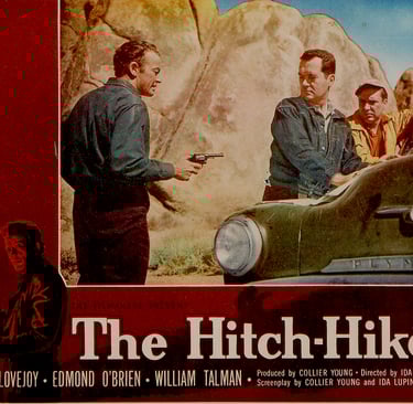 The Hitch-Hiker was a film noir thriller that aimed to explore the mind of Emmett Myers, frequently contrasting the typical middle-class man with the emotionally hollow Emmett, the crazed killer with the lazy eye. Noticing Roy’s wristwatch, Roy proudly mentions that his wife gave it to him. Emmett replies proudly that, at age 17, he took it, viewing gifts and love as signs of weakness because he believes he must always be in control. Worrying about others is seen as losing one’s way and depending on others, a weakness, while Emmett believes you are alone and gain strength from that solitude. Being connected with others and relying on each other is considered "being soft” in his world. In reality, what Emmett admits is that attachment to others is a weakness because he has never truly been loved. He is a survivor, very much alone in this world, and hates those he secretly longs to be like. Emmett remains the ultimate outsider.