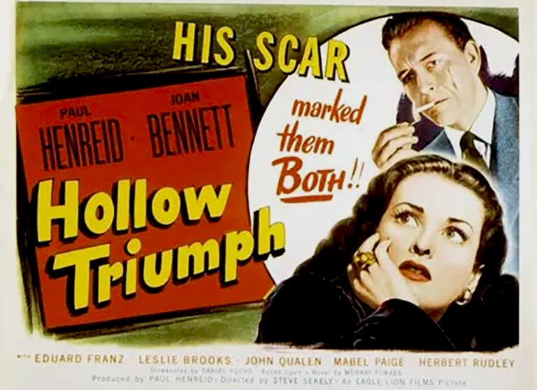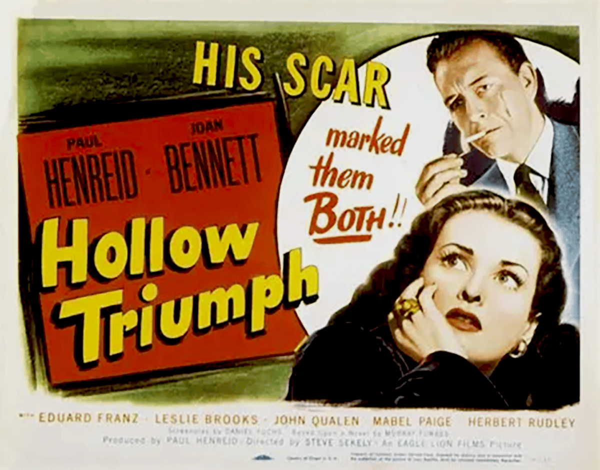Hollow Triumph (also known as The Scar and other titles) is mostly forgotten today. Still, it marks Paul Henreid’s uncredited directing debut after the credited director Steve Sekely was fired from the project, and producer/star Henreid took over the reins. It’s a fine movie, but a quirky noir featuring a complicated and hardly believable plot. But it is ironic, primarily due to a series of many real coincidences, and that aspect fascinates me the most. Along with perhaps Detour, it should be remembered as the ironic noir.