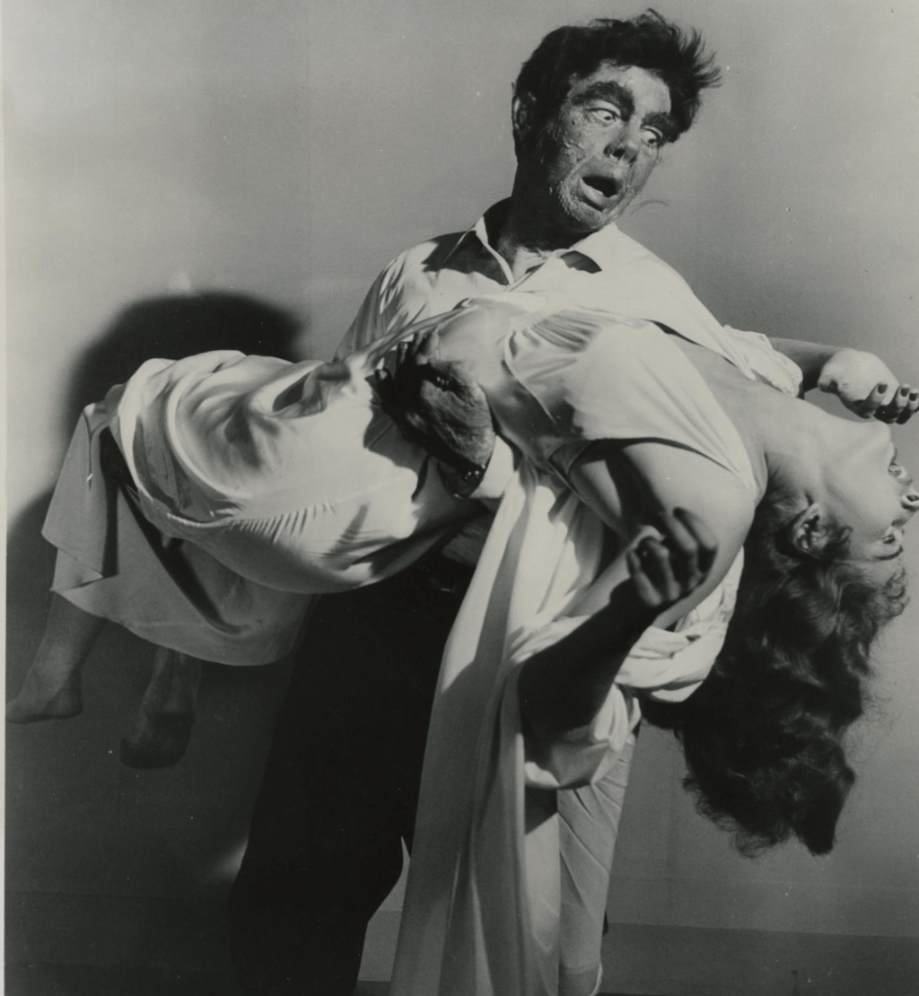 Director Paul Landres confidently imagined and handled the horror sequences, whether it’s the scene in which the beast pursues Coleen Gray down a neighborhood street, with her looking back to see the shadowy, undefined fiend in noirish blacks and whites, or Will Beaumont staying with Beecher in the lab to make sure he doesn’t take any more of the regression pills. His addictive personality makes him beg and quiver for more pills, as he slowly transforms into a primitive monster without taking any more drugs. Priscilla the dog’s performance, as she flees in fear for her life while the beast jumps out of the darkness to kill Mrs. Dietz, is wonderfully conceived. Landres is adequate with the actors’ dialogue, but he is gifted at blocking the horror sequences. His use of shadow and horror is masterful. Perhaps we should also credit cinematographer Jack MacKenzie.