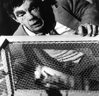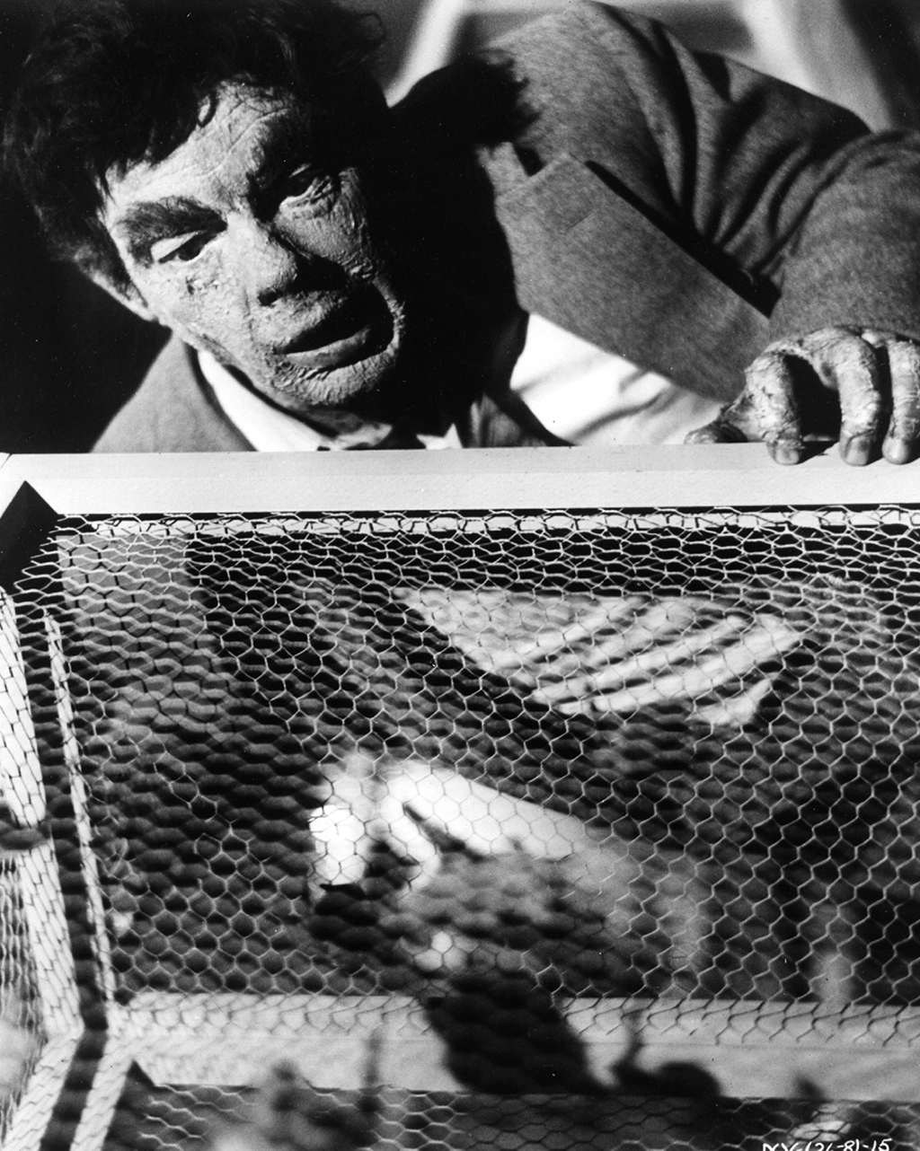 THE VAMPIRE IN A PUBLICITY SHOT CONFRONTING A CAGE OF VAMPIRE BATS.