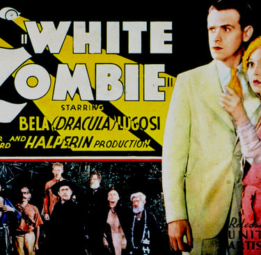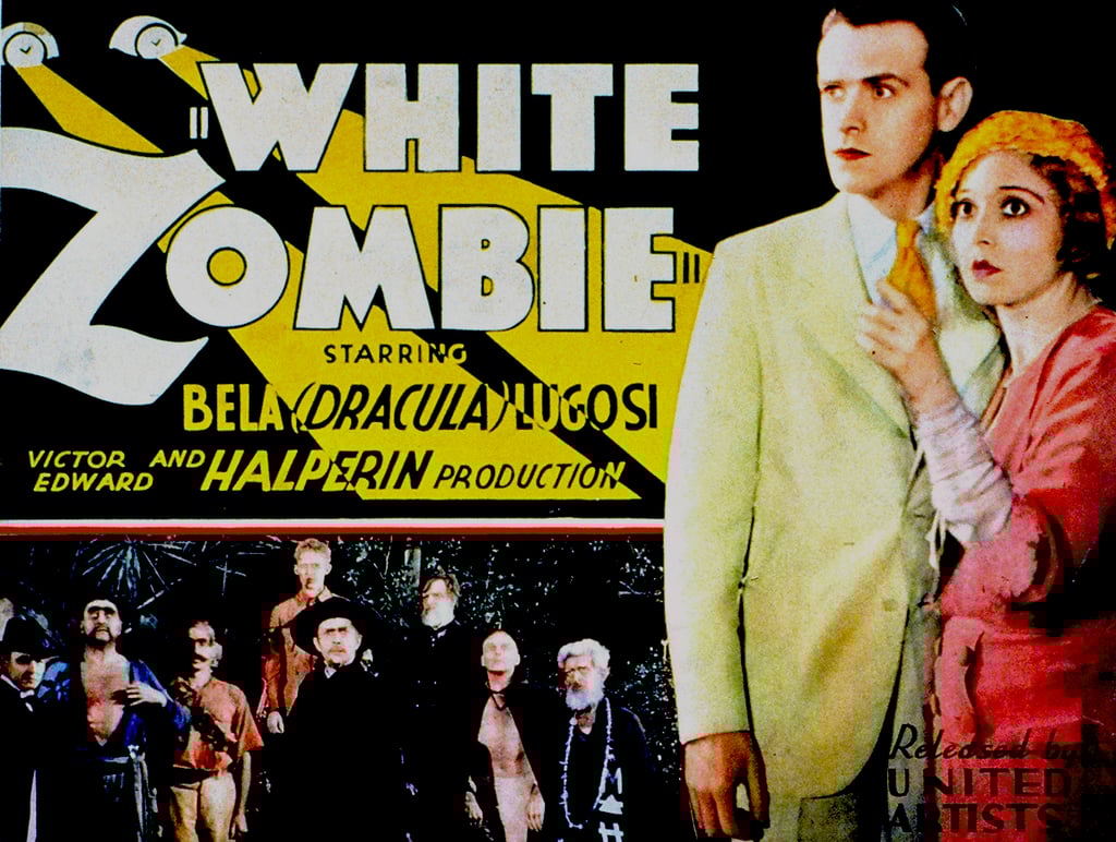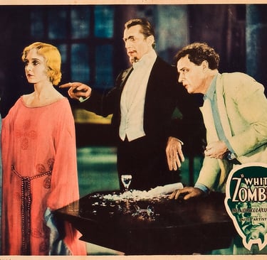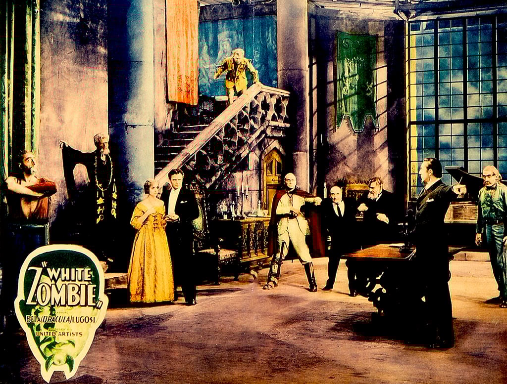 White Zombie has been cited as extremely boring, but I find it an early horror classic (it was filmed only a year after Universal’s Dracula and the same year as Universal’s Frankenstein). It was an independent film produced by the Halperin Brothers and also directed by Victor Halperin. While it is creakier than all the early Universal horror classics, it contains a rather eerie musical score and many special effects to curdle the blood. When Madeline is released from her trance, the background scenery around her grows lighter. We hear the squawks of a vulture, approximating the sound of a person screaming. We have many superimpositions of Bela Lugosi’s intense eyes dominating the screen. We have the doom-laden mood of jungle drums beating.
